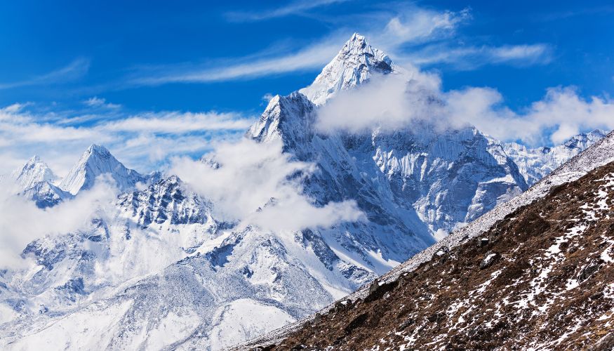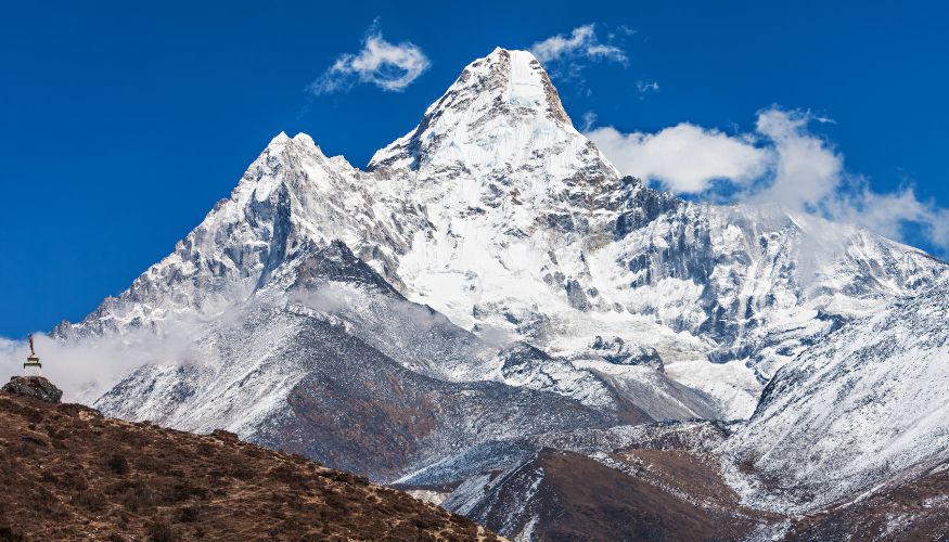 Ama Dablam is known as the “Matterhorn of the Himalayas” for its striking pyramidal shape, making it one of the world’s most photographed mountains. It towers over the Everest Base Camp trekking route, inspiring all climbers with its beautiful mountain views.