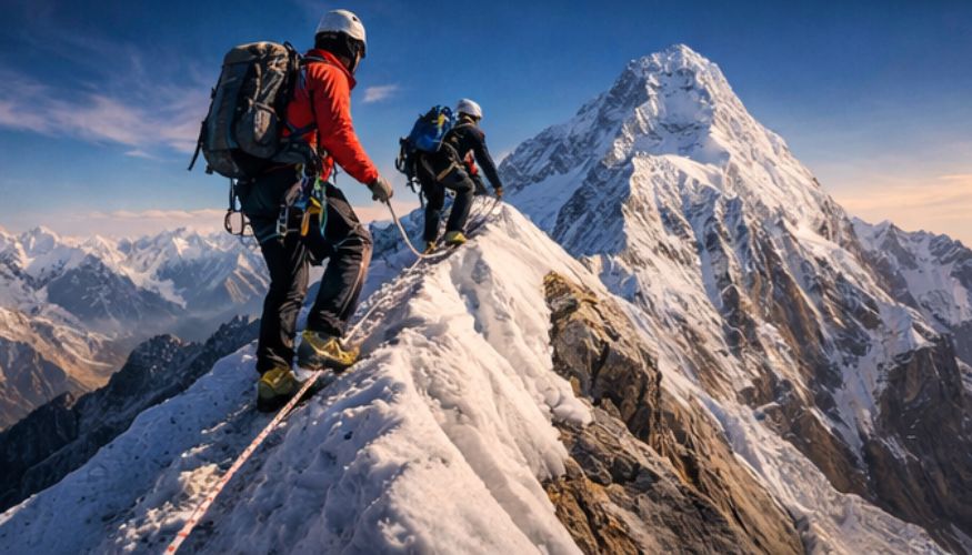 However, it is still a serious climb in the Himalayas, which entails risks like rockfall, icefall, ridges that drop over 1,000 meters, bad weather, and altitude sickness if you ascend higher than 6,000 m. It is safer than climbing any of the 8,000 m peaks but tougher than a trekking peak like Island Peak.